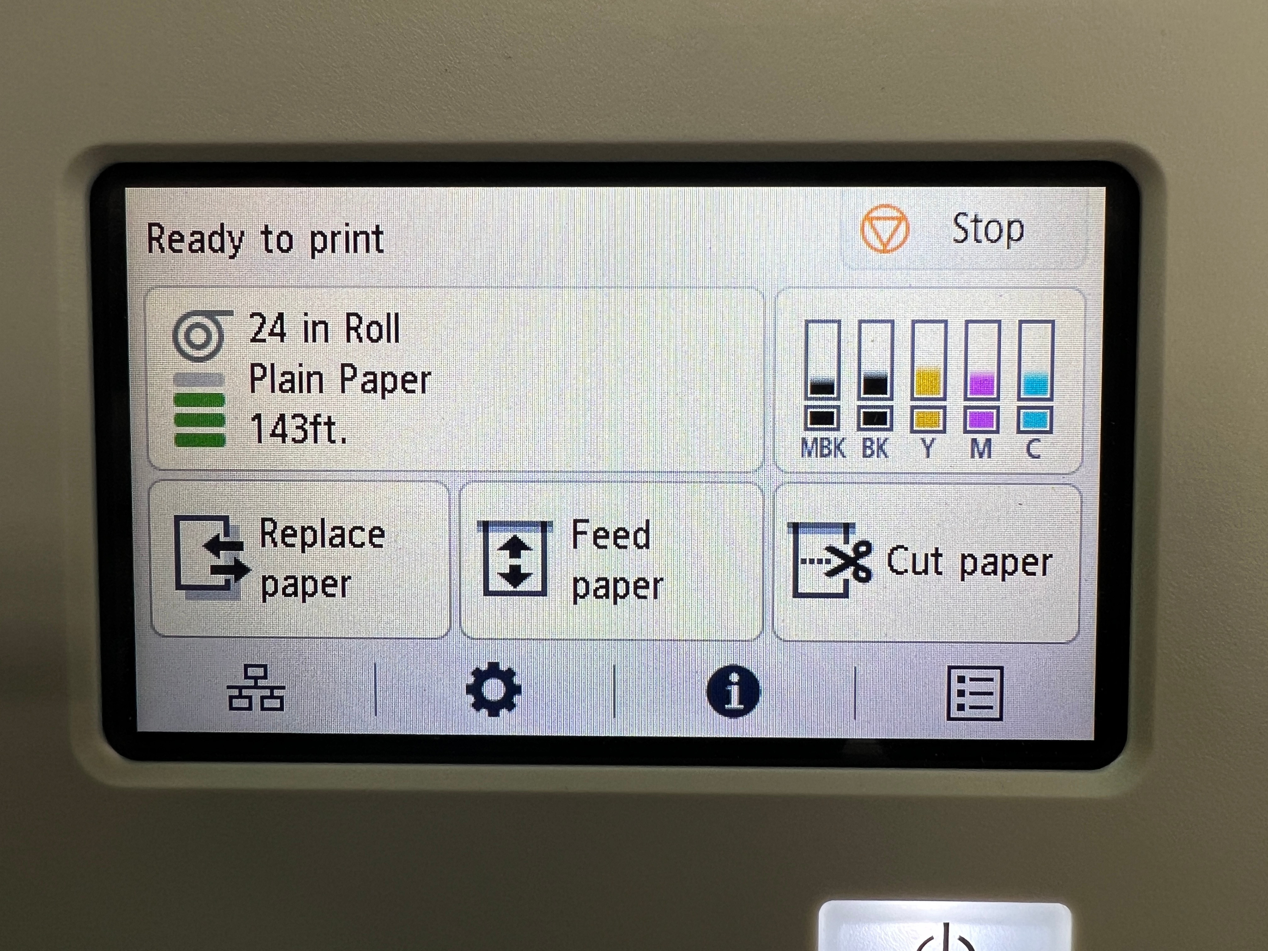 The ink cartridges on this machine are refillable. Do not refill ink unless you have been shown how to do so by a steward. If you see that the ink is running low, contact Jonathan White on Slack. The ink colors are