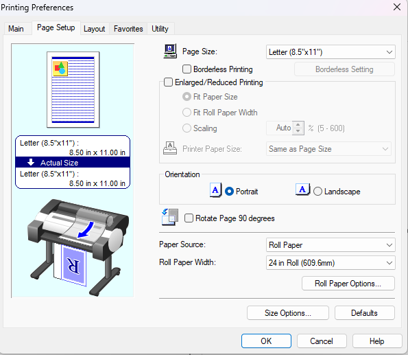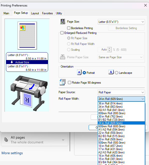 - Select the correct "Paper Source" and "Roll Paper Width" based on the paper you are using.