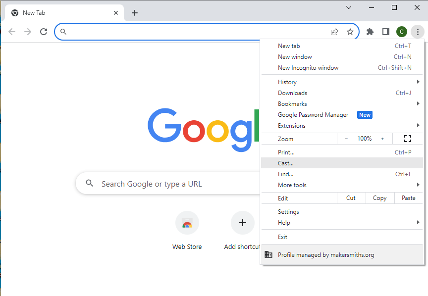 - Using the "Sources" drop down select either Cast Tab or Cast Screen Cast Tab will send the selected browser tab, Cast Screen will send the entire screen.