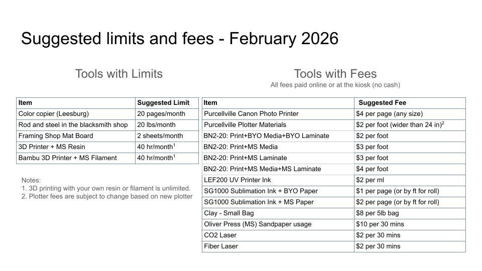 Motion: Move to adjust the fee structure and tool limits as follows: